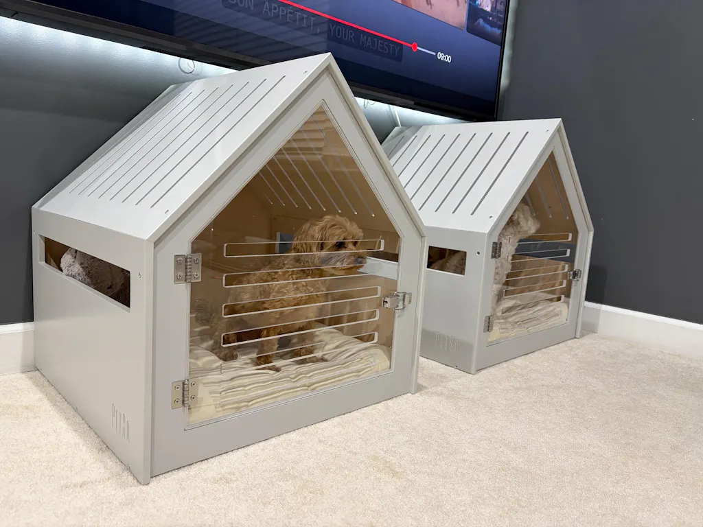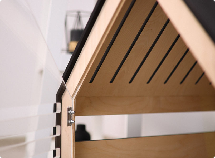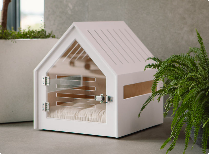 The crate is designed with proper ventilation in mind, featuring slotted openings that maintain fresh air circulation. Its materials are eco-friendly and non-toxic, reflecting a commitment to sustainability. This design caters to the natural needs of animals, offering a cozy and safe retreat. Perfect for interiors with minimalist or Scandinavian aesthetics.