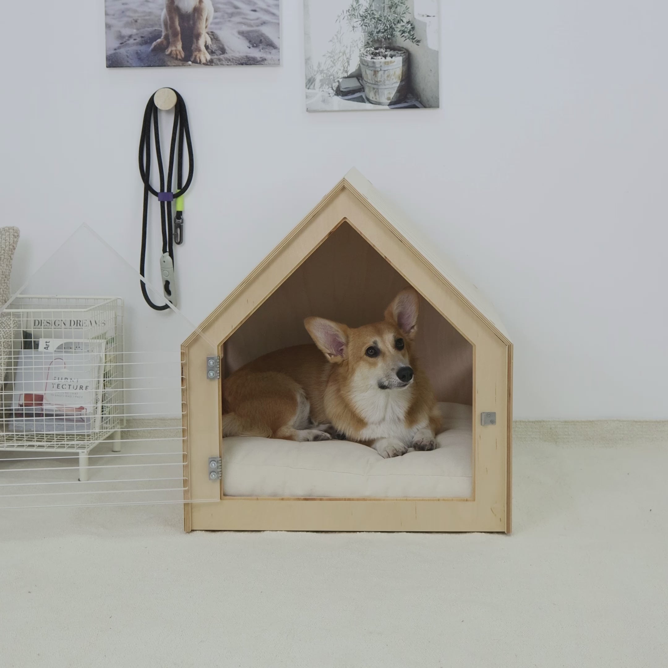 The crate is designed with proper ventilation in mind, featuring slotted openings that maintain fresh air circulation. Its materials are eco-friendly and non-toxic, reflecting a commitment to sustainability. This design caters to the natural needs of animals, offering a cozy and safe retreat. Perfect for interiors with minimalist or Scandinavian aesthetics.
